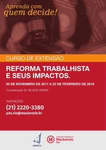 Tendo em vista as mudanças decorrentes da reforma trabalhista, a Amatra1, em parceria com a Faculdade Presbiteriana Mackenzie Rio, está promovendo o curso de extensão “Reforma Trabalhista e seus impactos”.