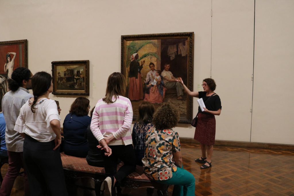 A segunda parte da visita foi guiada por Daniela Muller, que analisou os quadros Retrato de Dom João VI (1817), de Jean Baptiste Debret; Primeira Missa no Brasil (1860), de Vítor Meireles; e Redenção de Cã (1895), de Modesto Brocos. A partir dos elementos das imagens, a juíza apresentou aspectos da formação da identidade nacional, com base em estudos de teóricos, como Stuart Hall, e de questões raciais e sociais presentes na sociedade brasileira.