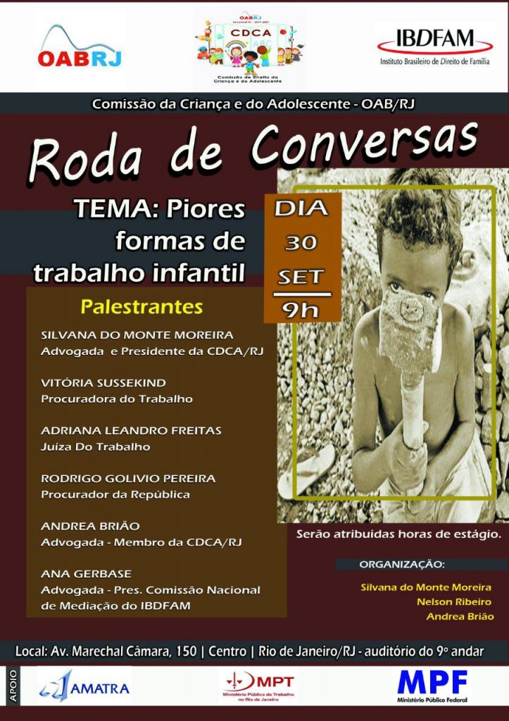 Além do apoio da AMATRA1, a roda de conversa organizada pela Comissão da Criança e do Adolescente (CDCA/RJ) da OAB terá a participação do Instituto Brasileiro de Direito de Família (IBDFAM), com o Ministério Público do Trabalho no Rio de Janeiro (MPT) e com o Ministério Público Federal (MPF).