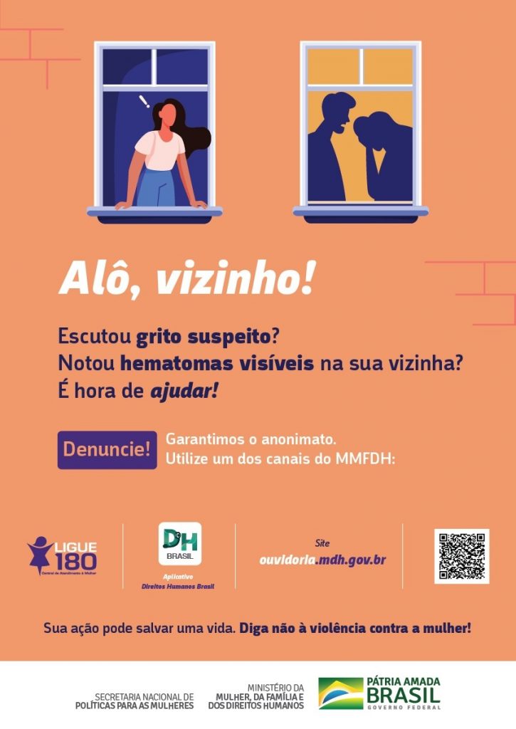 O Ministério da Mulher, da Família e dos Direitos Humanos também lançou campanha para informar sobre as agressões sofridas por mulheres e incentivar o apoio entre vizinhos. Foram criados cartazes e panfletos orientando sobre os atos de violência previstos na lei Maria da Penha e informando canais de denúncias, como o Ligue 180, que funciona 24 horas por dia com garantia de anonimato; o aplicativo Direitos Humanos Brasil; e o portal da Ouvidoria Nacional dos Direitos Humanos (ONDH).