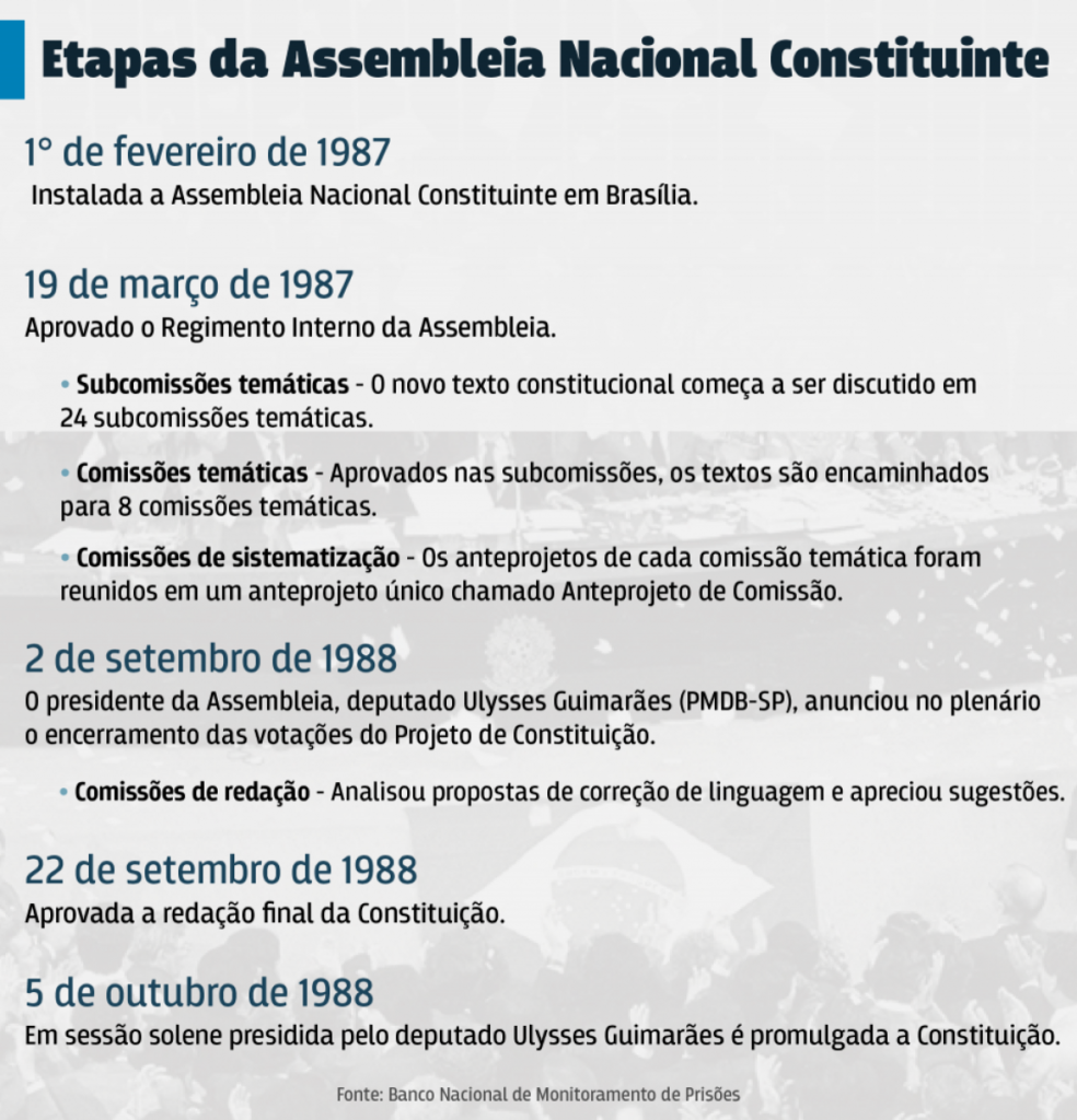O trabalho da Constituinte durou um ano e oito meses, e sua tramitação obedeceu a sete etapas no Congresso Nacional, culminando com a sua promulgação em 5 de outubro de 1988.