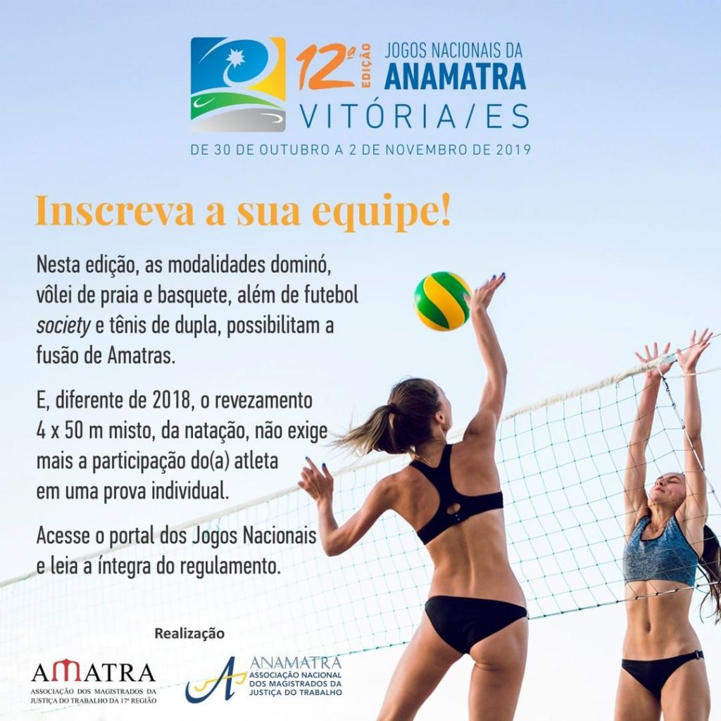 A 12ª edição dos Jogos Nacionais da Anamatra terá novidades em sua programação. O basquete vai fazer parte do evento, de 30 de outubro a 2 de novembro, em Vitória (ES). Os associados e acompanhantes interessados em participar dos jogos ou das torcidas devem se inscrever no site até às 17h de 15 de outubro.