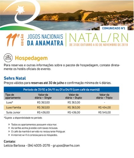 Os magistrados que participarão do 11º Jogos Nacionais da Anamatra, em Natal (RN), têm até a próxima segunda-feira (30) para aproveitar as tarifas especiais no Serhs Natal, hotel oficial da competição. Os valores promocionais são válidos para quatro diárias. Os jogos serão disputados de 31 de outubro a 3 de novembro. As inscrições serão abertas em 22 de agosto.