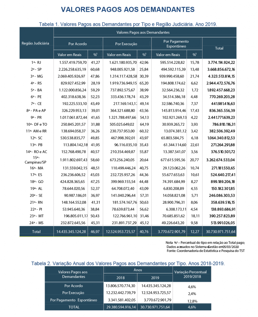Os dados foram divulgados pela Coordenadoria de Estatística e Pesquisa do Tribunal Superior do Trabalho (TST), que analisou as informações encaminhadas pelos Tribunais Regionais do Trabalho (TRTs).