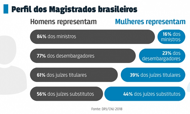 O relatório "Perfil Sociodemográfico dos Magistrados - 2018" demonstrou que a participação de mulheres no Poder Judiciário aumentou, mas ainda está muito abaixo dos homens. O percentual de mulheres é de 38%, enquanto o de homens é de 62%. Na década de 1990, a participação de mulheres era de 25%, contra 75% de homens.