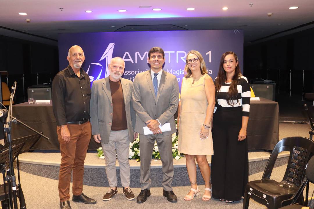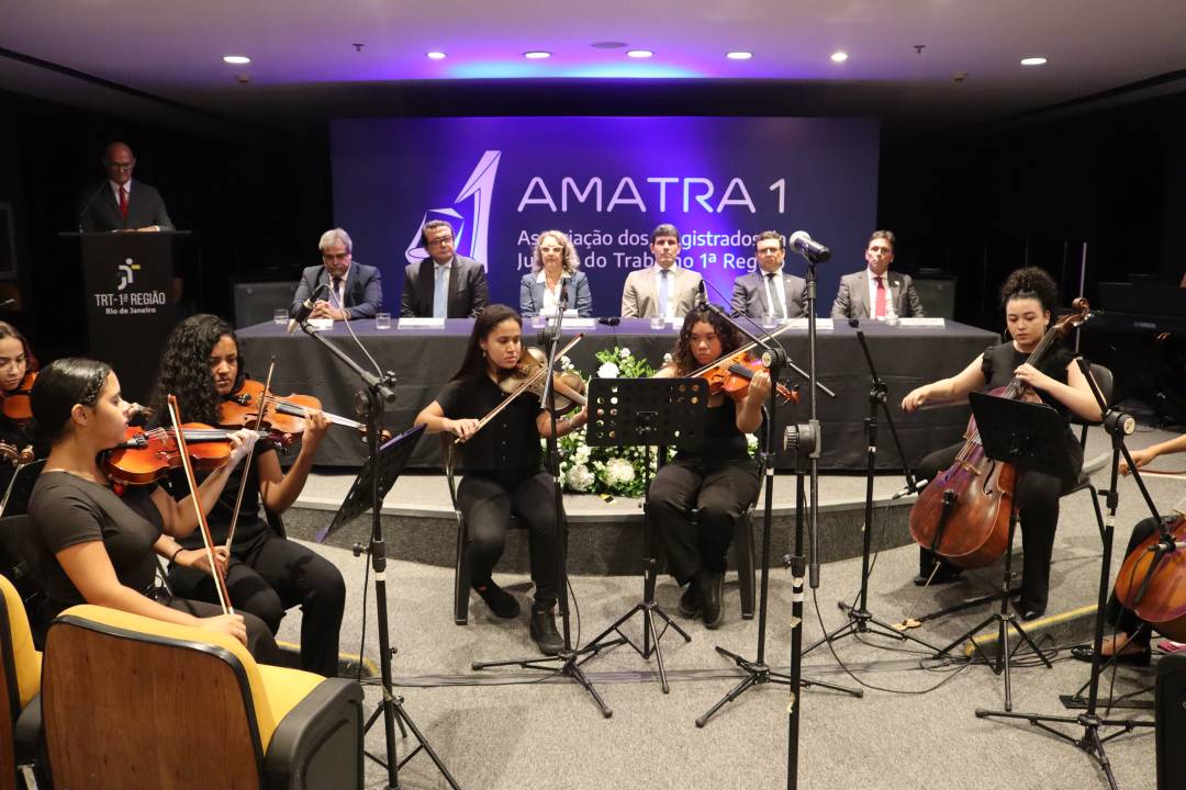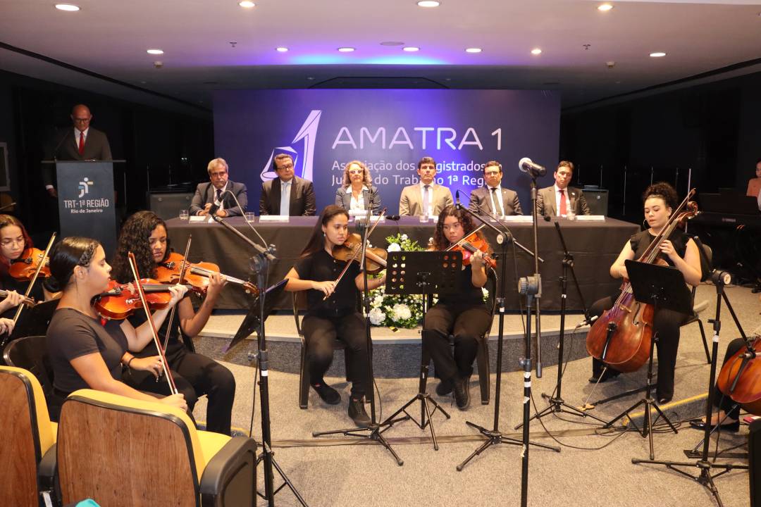 A cerimônia teve início com a formação da Mesa Diretora, composta pelo presidente empossado, Rafael Pazos, posicionado ao lado do presidente do Tribunal, Roque Lucarelli; do vice-presidente do TRT-1, Leonardo Pacheco; da ex-presidenta da AMATRA1, Daniela Muller; do presidente da Anamatra, Valter Pugliese; e do corregedor-regional, Alvaro Carvalho.