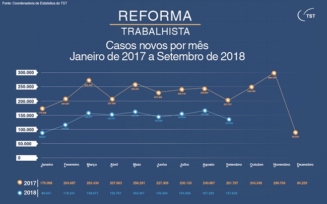 Após um ano de vigência, a Reforma Trabalhista reduziu o número de ações, alterou os temas mais reclamados na Justiça do Trabalho e não alcançou o objetivo de impulsionar a geração de empregos formais. Segundo dados divulgados pelo TST (Tribunal Superior do Trabalho), houve redução de 36% nos processos entre janeiro e setembro deste ano, na comparação com o mesmo período de 2017. Foram 1.207.208 ações contra 2.013.241 registradas nos meses primeiros meses do ano passado.