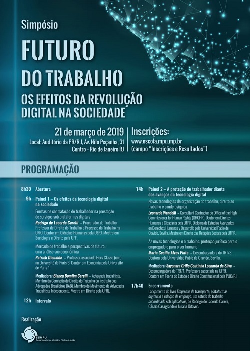 O Simpósio “Futuro do Trabalho: os Efeitos da Revolução Digital na Sociedade” vai discutir os impactos dos avanços tecnológicos no mundo do trabalho, na quinta-feira (21), no auditório da Procuradoria da República no Rio de Janeiro. O evento é organizado pela Escola Superior do Ministério Público da União e as inscrições podem ser feitas até terça-feira (19) pelo site www.escola.mpu.mp.br.