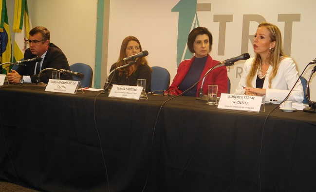 No segundo dia do seminário "Desafios para proteção dos direitos sociais nas relações de trabalho", foram debatidas as mudanças no mercado de trabalho a partir da lei da terceirização (13.429/2017) e da reforma trabalhista (13.467/2017). A mesa foi presidida pela procuradora do MPT-RJ (Ministério Público do Trabalho do Estado do Rio de Janeiro), Teresa Basteiro, e contou com a presença do procurador-chefe do MPT-RJ, Fabio Goulart Villela, da juíza do trabalho Roberta Ferme Sivolella, e da professora de Direito da UFF (Universidade Federal Fluminense) Carla Apolinário.