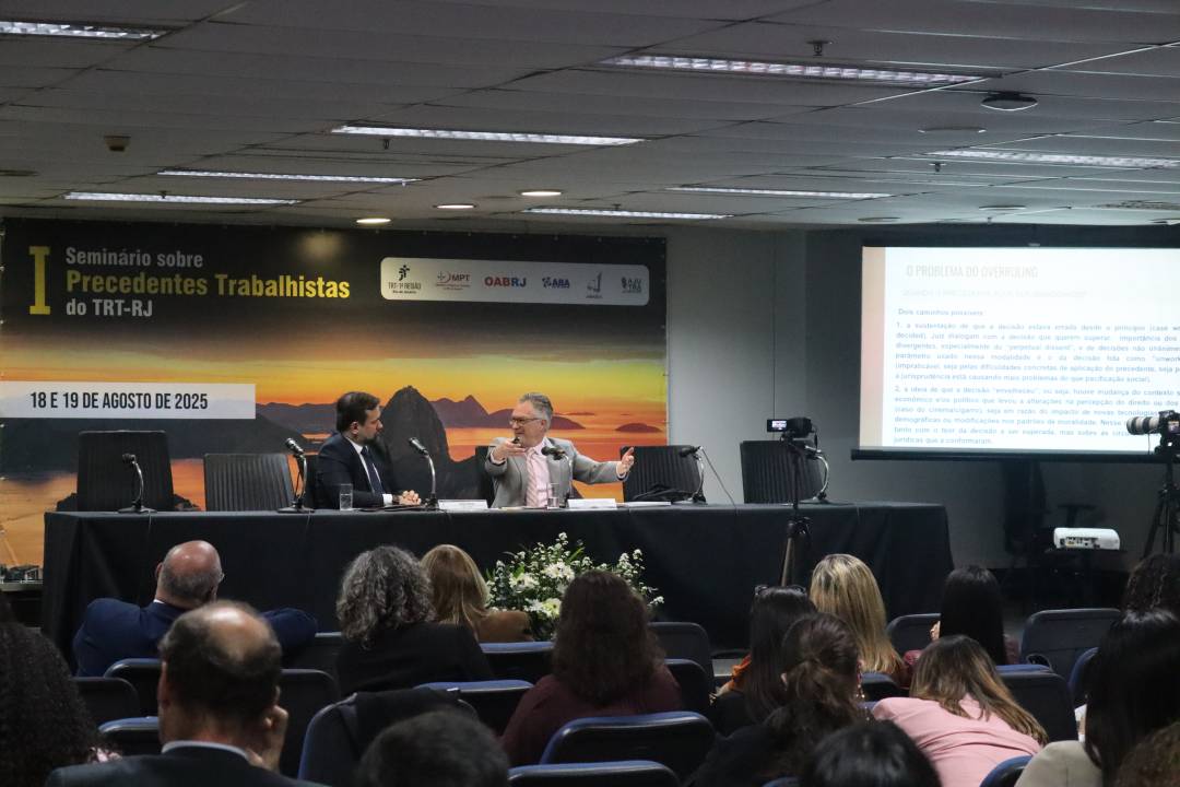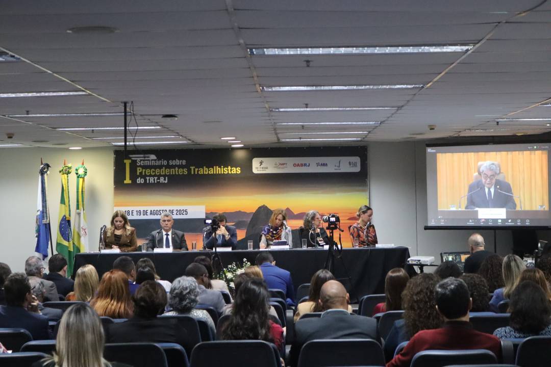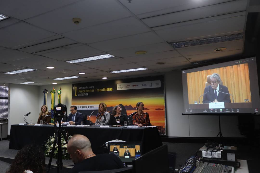 Em seguida, o ministro Augusto César Leite de Carvalho promoveu uma aula magna, que antecedeu os primeiros debates do seminário.  Ele abordou as profundas transformações da Justiça do Trabalho no Brasil, com ênfase na consolidação do sistema de precedentes vinculantes como ferramenta central para uniformizar decisões, aumentar a previsibilidade e liberar o foco da Corte para novas controvérsias.
