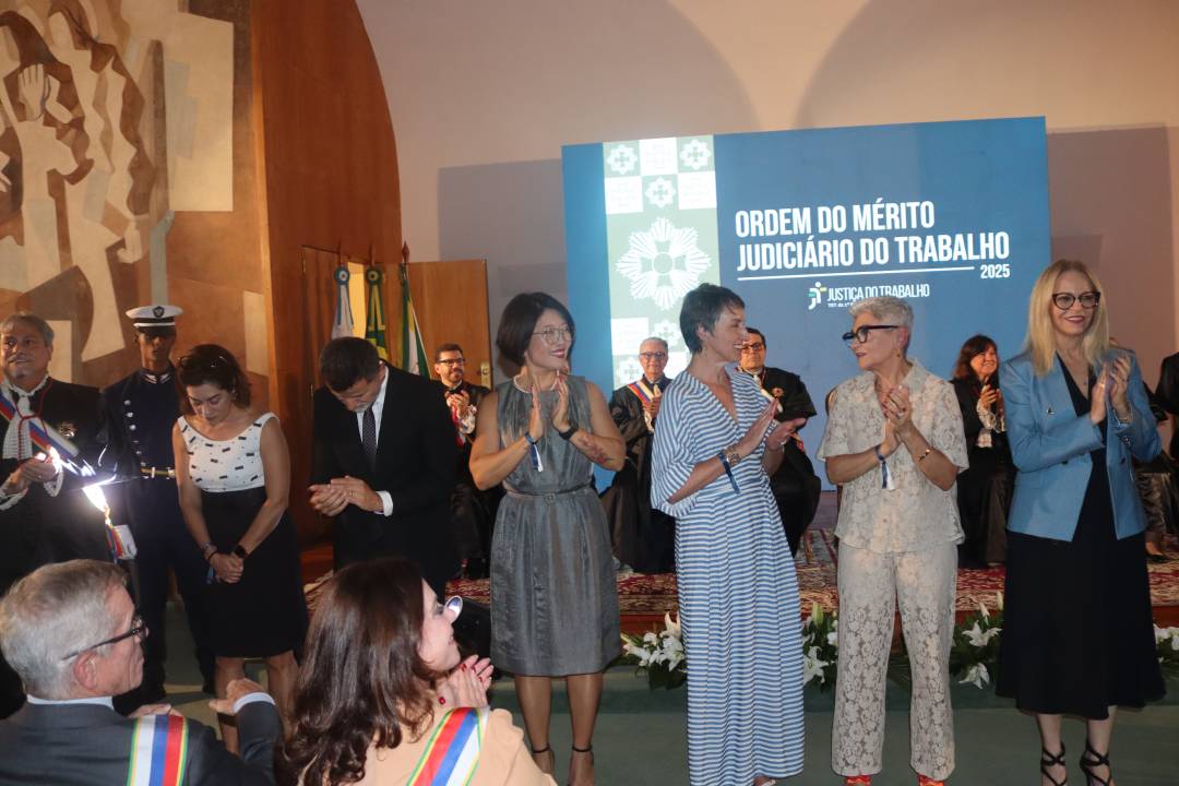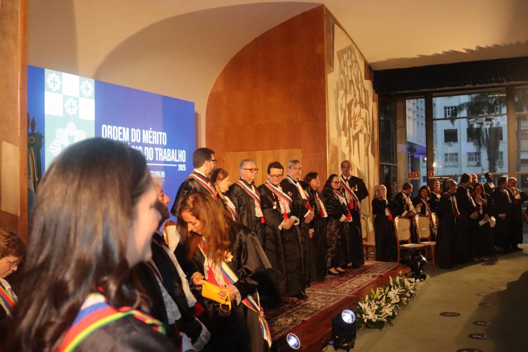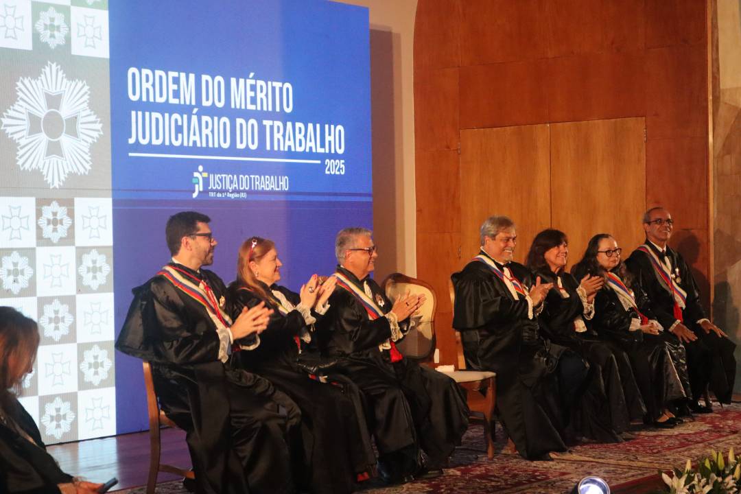 Três associados da AMATRA1 receberam na quinta-feira (13), no Palácio Gustavo Capanema, a Ordem do Mérito Judiciário do Trabalho de 2025, homenagem outorgada pelo TRT-1 a 67 personalidades por suas contribuições à Justiça do Trabalho e à cultura jurídica. Os associados agraciados com o grau de Comendador foram os juízes Renata Jiquiriçá, Paulo Rogério dos Santos e Mirna Rosana Ray Macedo Corrêa. A presidenta da AMATRA1, Daniela Muller, acompanhou a cerimônia e saudou os homenageados.