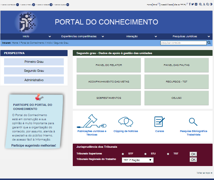 O Portal do Conhecimento, organizado por assunto, oferece ferramentas de apoio às varas, gabinetes, turmas e diversos setores administrativos, com informações compartilhadas pelas unidade, links úteis, boas práticas, páginas de pesquisas jurídicas e administrativas específicas, etc. O endereço é construído pela Secretaria de Gestão do Conhecimento (SGC) e gerenciada pelas Secretaria-Geral Judiciária (SGJ) e Secretaria da Corregedoria Regional (SCR).