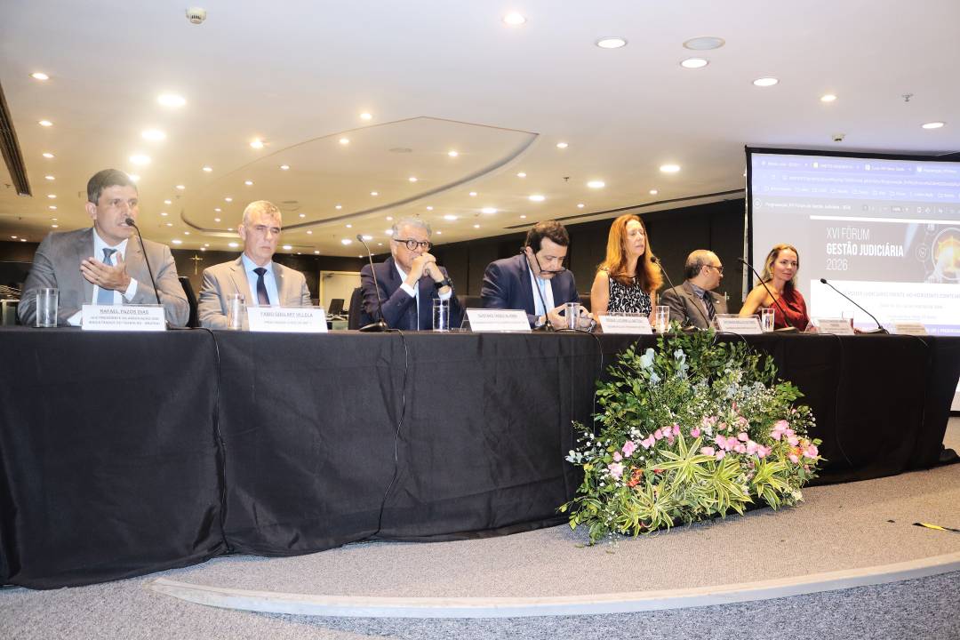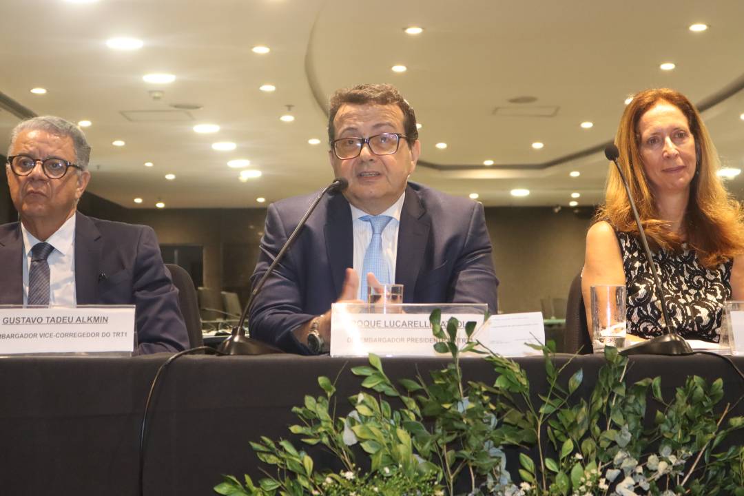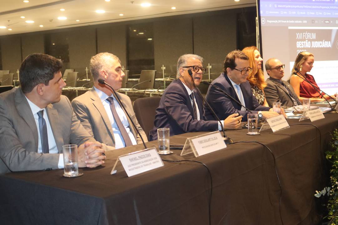 O XVI Fórum de Gestão Judiciária começou nesta quarta-feira (14), no Plenário Délio Maranhão, na sede do Tribunal, no Centro. Promovido pela Escola Judicial do TRT-1, o evento debate os rumos da Justiça do Trabalho e caminhos para decisões com enfoque social, inclusivo e antidiscriminatório. O encontro, que se estende até sexta-feira (16), teve na mesa de abertura, entre outras autoridades, o presidente do Tribunal, desembargador Roque Lucarelli, a diretora da Ejud1, desembargadora Sayonara Grillo, e o juiz Rafael Pazos, que participou de seu primeiro evento institucional em 2026 como presidente da AMATRA1.